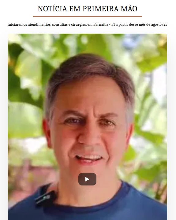A partir de agosto / 2025, iniciamos os atendimentos de consultas e também a realização de cirurgias na cidade de Parnaíba - PI. Se você é da região de Parnaíba ou cidades vizinhas, estamos à sua disposição.